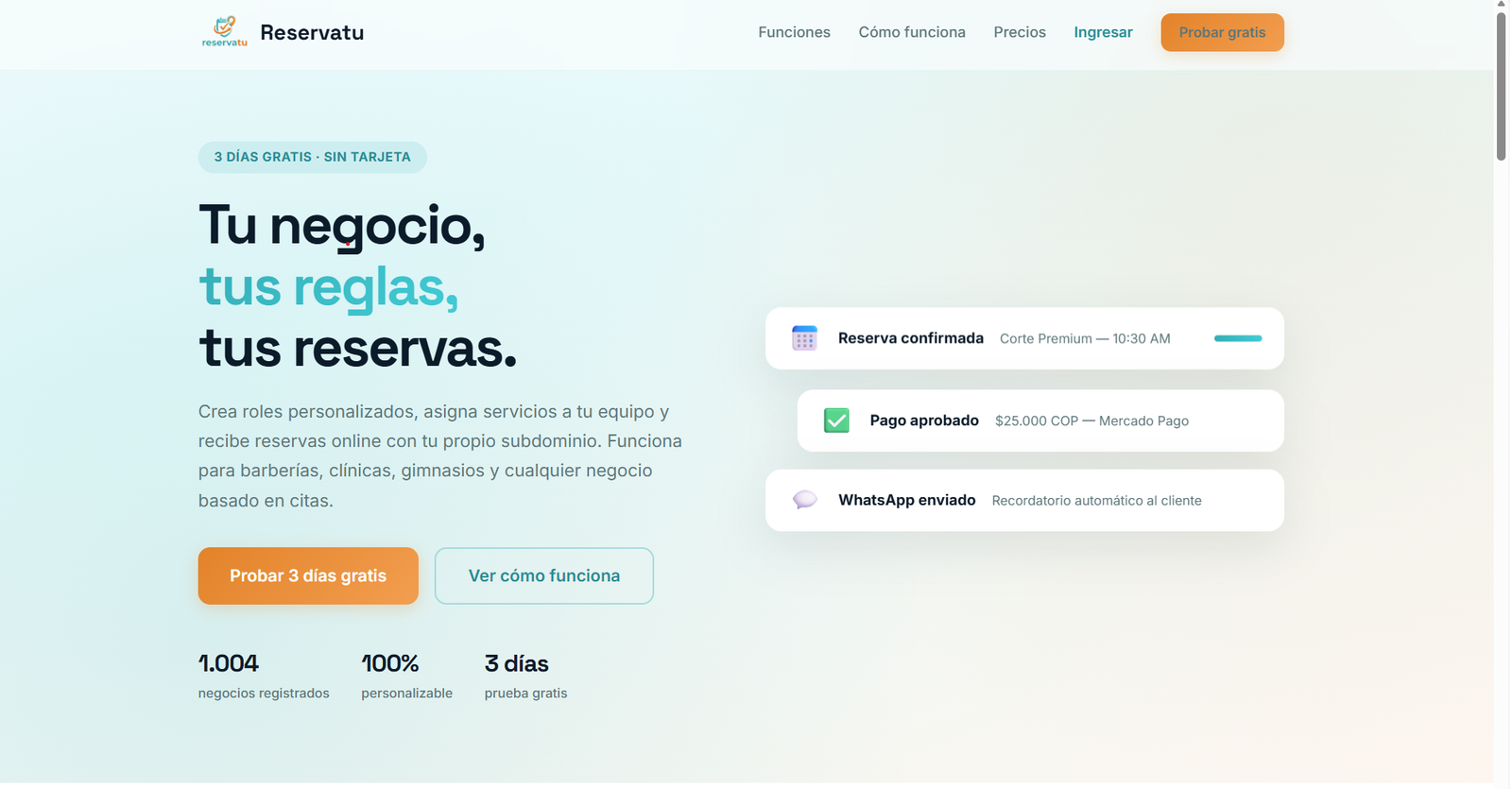 Cada negocio puede usar su propio subdominio, por ejemplo tunegocio.reservatu.com, alineado a tu nicho.
